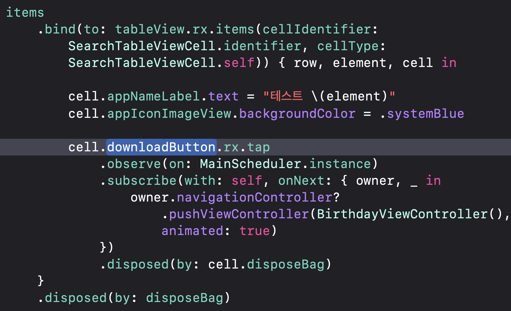 아래 예시는 Cell 내부의 어떤 버튼을 탭했을 때 다른 VC로 이동하는 이벤트를 발생하는 스트림(Stream)을 구성한 코드이다.