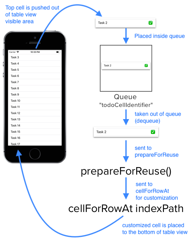 iOS에서는 UITableViewCell과 UICollectionViewCell을 사용할 때, 보여줘야할 Cell들을 모두 새롭게 생성하는 것이 아니라 화면에 보이는 부분만 생성하고 재활용하는 로직을 수행한다.(메모리 효율성 고려)