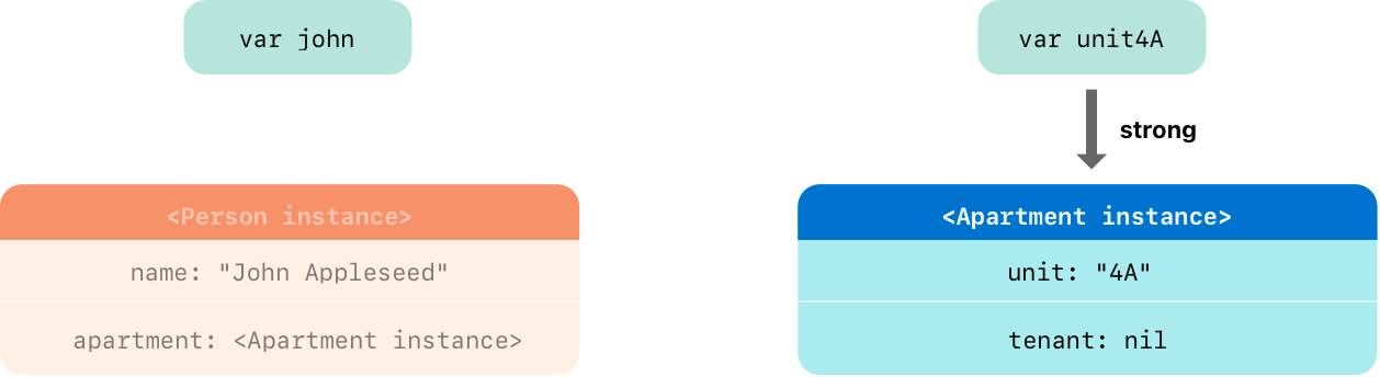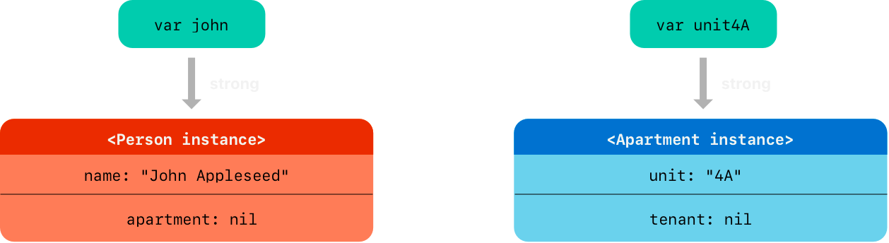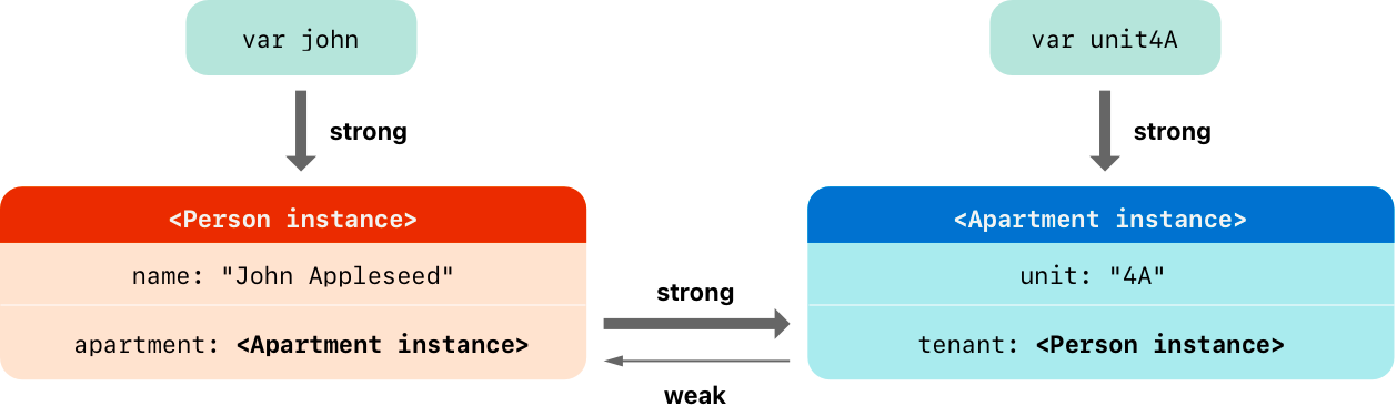 위 그림을 보시면 Person Instance는 Apartment Instance에 대해 강한 참조를 하고 있지만, Aparment Instance는 Person Instance에 대해 약한 참조(Weak Reference)를 하고 있다는 것을 알 수 있습니다. 이 말은 john 변수가 가지고 있는 Person Instance에 대한 강한 참조를 nil 세팅함으로써 끊게 만들면, 더 이상 Person Instance에 대한 강한 참조가 존재하지 않게 된다는 의미입니다.
