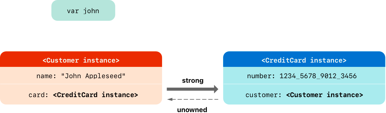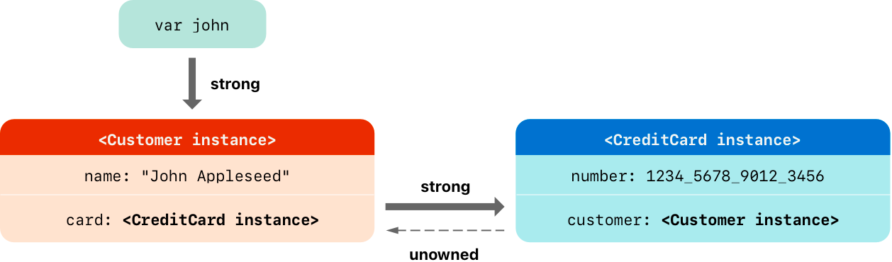 위 그림을 살펴보시면 Customer Instance는 CreditCard에 대한 강한 참조를 가지고 있으며, 반대로 CreditCard는 Customer Instance에 대한 비소유 참조를 가지고 있다는 것을 알 수 있습니다.