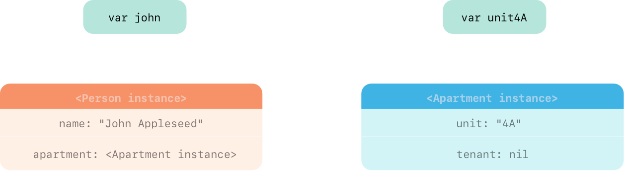 아래 코드 처럼 각각 Person Instance를 담을 john 변수와 Apartment Instance를 담을 unit4A 변수를 아래와 같이 선언하여 각각 Person Instance와 Apartment Instance를 할당해주었습니다.