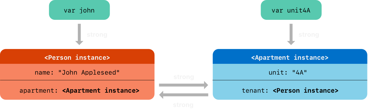 이렇게 되면 결론적으로 아래 그림과 같이 Person Instance와 Apartment 사이에 강한 참조가 남아있어 메모리가 누수(Memory Leak)되어 메모리가 해제되지 않는 현상을 보실 수 있습니다. 이러한 현상을 강한 순환 참조(Strong Reference Cycles)라고 일컬어 집니다.