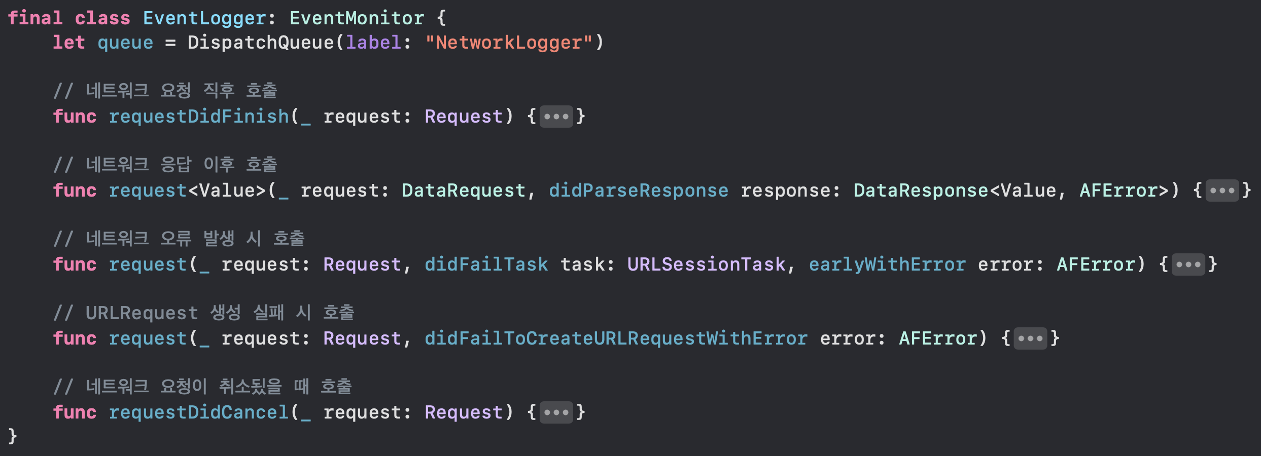 위 정의는 다시 말하면 EventMonitor은 Alamofire 이벤트들을 관찰하고 검사할 수 있도록 도와주는 프로토콜이라는 의미입니다.