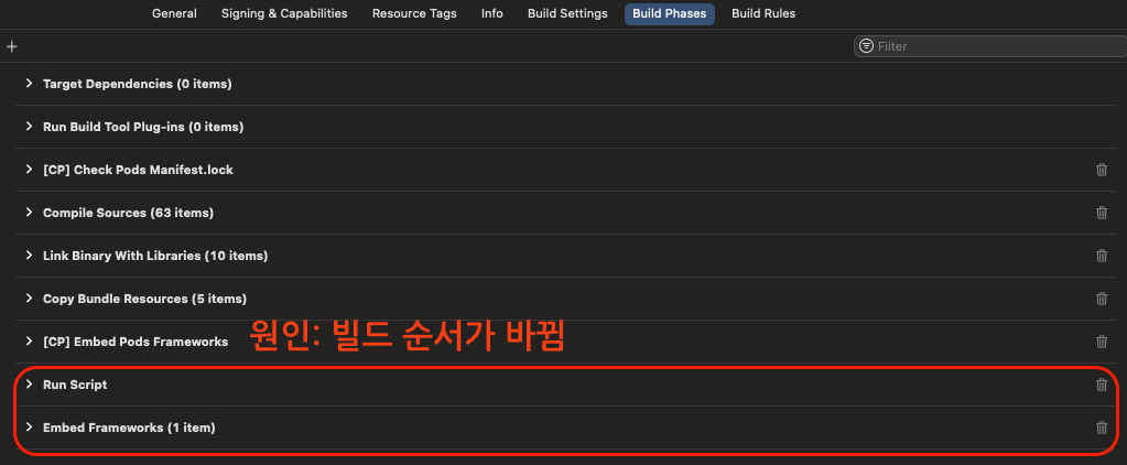 그래서 Run Script와 Embed Frameworks의 위치를 바꾸어 문제 해결하였습니다.