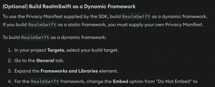 위 사진을 보시면 Dynamic Framework로 빌드하기 위한 설정을 Optional이라고 명시되어 있지만 실제로 Realm-Swift v10.49.3에 대한 Release Note를 살펴보면 Static Framework로 빌드할 경우, Privacy Manifest를 개발자가 직접 지정해주어야 한다고 합니다. 하지만 Dynamic Framework로 빌드를 하면 자동으로 Privacy Manifest에 대응이 되기 때문에 개인적으로 위 사진과 같은 설정 과정을 거처 Dynamic Framework로 빌드하는 것이 Privacy Manifest에 대한 좀 더 효과적인 방법으로 보입니다.
